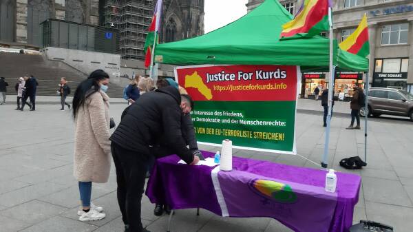 Demokratik Kürt Toplum Meclisi öncülüğünde açılan stantta kampanyanın amacına ilişkin bildiri okundu. PKK’nin AB’nin “terör örgütü” listesinde çıkarılması gerektiği belirtilerek, Alman kamuoyuna duyarlılık çağrısı yapıldı.