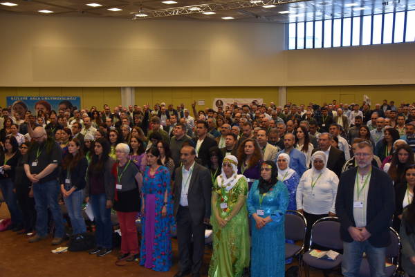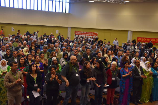 Kongre saat 11’de Kürdistan ve Dünya devrim şehitleri için gerçekleştirilen saygı duruşuyla başladı. Cizre direnişinin sembol isimleri Mehmet Tunç ve Asiye Yüksel, Paris katliamında katledilen Sakine Cansız, Fidan Doğan ve Leyla Şaylemez’in yanı sıra Mayıs ayı şehitlerinin posterlerinin asıldığı salonda “Diz çökmediniz, sizinle gurur duyuyoruz” pankartı dikkat çekti.