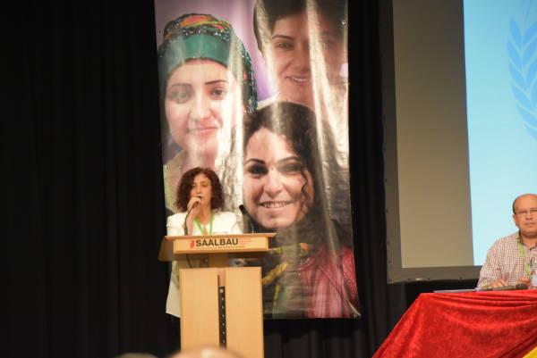 Eş Başkan Fatoş Göksungur da devletin zulmüne karşı her gün alanlarda olan Kürtleri selamlayarak zulme karşı durmanın kendileri için gurur kaynağı olduğunu söyledi. Göksungur, Almanya’ya da Türk devletine silah satmaması çağrısında bulundu.