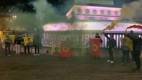 Eylemde dev bir Abdullah Öcalan’ın resminin ve “Liberte Pour Öcalan” yazılı pankart ve PKK flamaları taşındı.