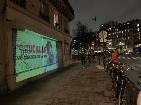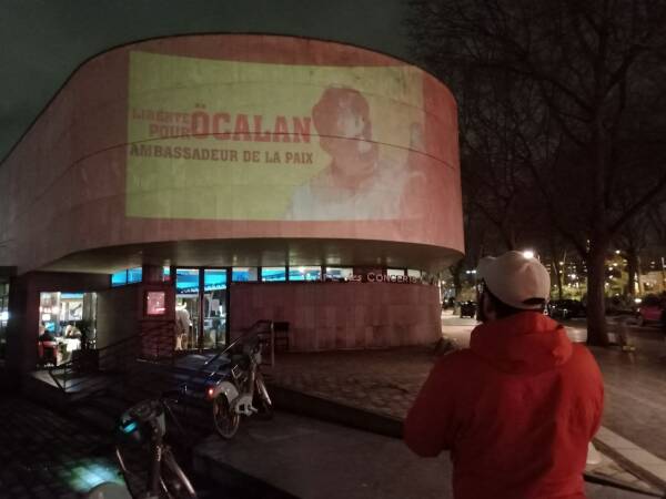 Paris Demokratik Kürt Toplum Merkezi öncülüğünde, Paris’in en işlek yerlerinde lazer-projeksiyon cihazları ile Kürt Halk Önderi Abdullah Öcalan’ın biyografisi ve 15 Şubat uluslararası komployu anlatan gösterimler duvarlara yansıtıldı.