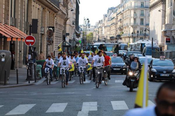 Çevredeki Fransız ve turistlerin yoğun ilgisini çeken eylemde Öcalan'a özgürlük tişörtleri giyilerek bisikletlere Öcalan'a özgürlük dövizleri ve Öcalan'ın fotoğrafının bulunduğu flamalar taşıyarak Öcalan'a özgürlük sloganları attılar.