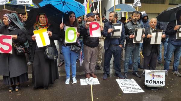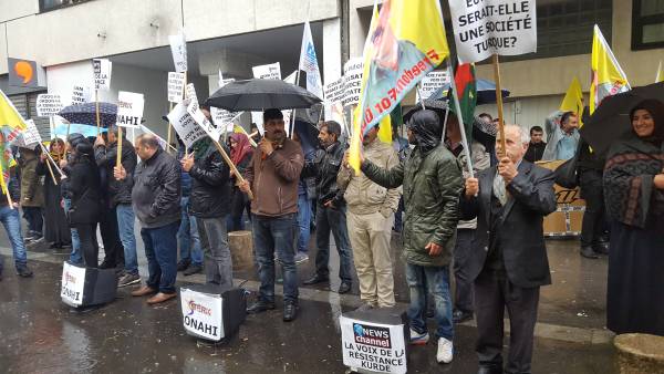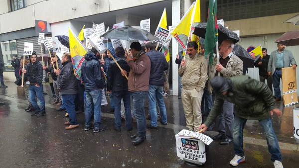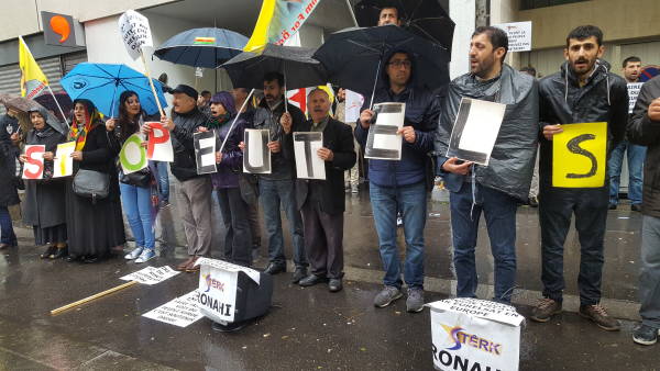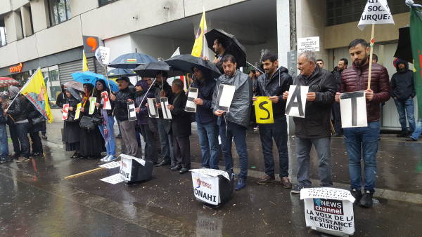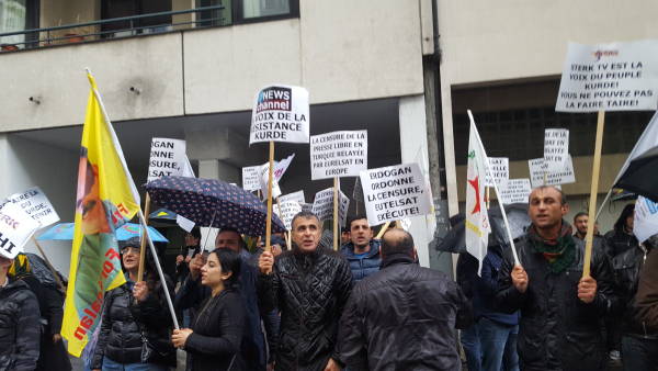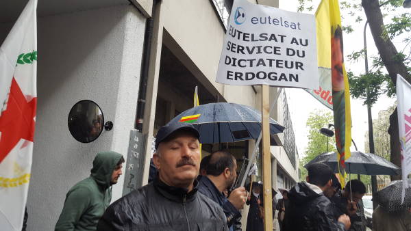 Eutelsat binası önüne kapatılmak istenen üç Kürt kanalın logolarının bulunduğu üç televizyon bırakan Kürdistanlılar "Eutelsat Erdoğan’ın servisinde", “Erdoğan diktatör Eutelsat destekçisi " dövizleri taşıyan Kürdistanlılar "DAİŞ Erdoğan Eutelsat destekçisi" sloganları atıldı.