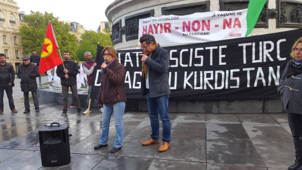 Eylem'de HDK-Fransa Eş sözcüleri Zeynep Birsel Ocak ve İbrahim Seydo Aydoğan birer konuşma yaptı.