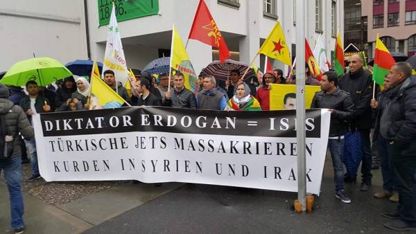 Luzern şehir merkezindeki protesto eylemine dört parçadan çok sayıda Kürdistanlı ve Kürt dostları katıldı. Tiyatro Binasının önünde bir araya gelen eylemciler sık sık Erdoğan ve Türkiye karşıtı sloganlar attı.