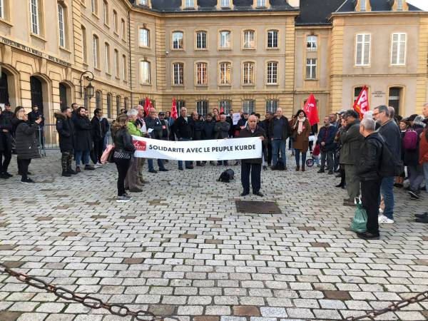 Metz Komünist Fransız Partisi, Rojava'ya karşı başlatılan işgal saldırısını Metz Valiliği önünde yaptığı eylem ile protesto etti. Eylem Cumartesi günü Strasbourg'da yapılacak bölgesel mitinge katılım çağrısının ardından sona erdi.