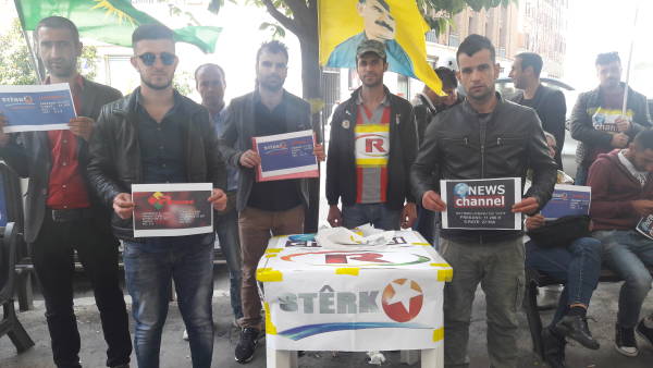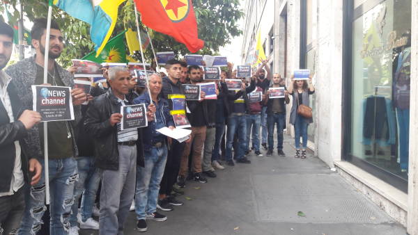 Bugün saat 15:00-18:00 arası Eutelsat ofisinin önünde bir araya gelen Kürdistanlılar ve İtalyan dostları News Channel, Stêrk TV ve Ronahî TV'nin yayınını durdurmak için harekete geçen Eutelsat’ı protesto eden bildiriler dağıttı.
