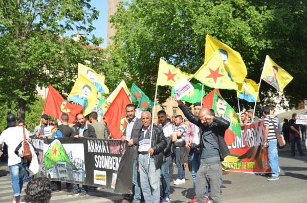 Ararat Kürt Kültür Derneği üyeleri de yürüyüş alanına Kürt Halk Önderi Abdullah Öcalan’ın posterleri, PKK bayrakları, YPG, YPJ flamaları ile katıldı.
