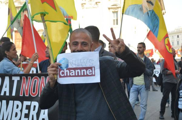 Kürtlerin katılması ile birlikte renkli sahnelerin yaşandığı yürüyüşte, Kürdistanlılar Eutelsat’ın Kürt televizyon kanallarının yayınını kesmesi yönündeki kararını da protesto etti.