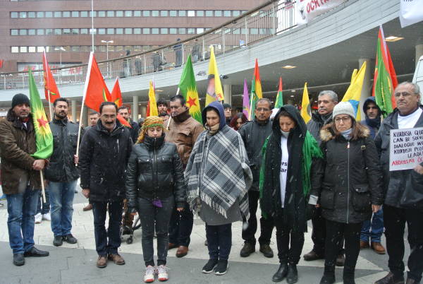 Kar yağışı altında yapılan gösteride bir konuşma yapan İsveç Demokratik Kürt Toplum Merkezi Ayşe Göktepe, Kürdistan'ın ilçelerini yerle bir eden ve Kürt halkını katleden AKP rejiminin darbe yaparak Kürt halkının seçilmiş temsilcilerini zindanlara attığı gibi tutsaklar üzerindeki baskı ve saldırılarını arttırdığını söyledi.