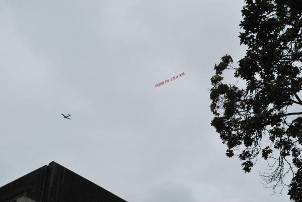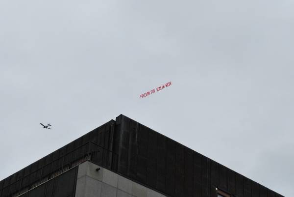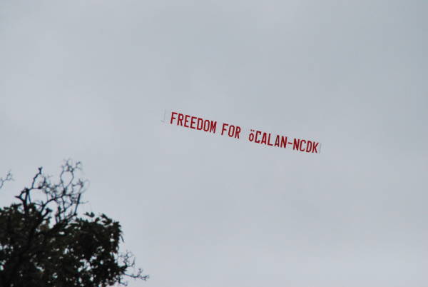 Yüzlerce Kürdistanlının Kürt Halk Önderi Öcalan'ın özgürlüğü için yürüdüğü sırada, Stockholm semalarında da İngilizce ”Öcalan'a özgürlük” pankratı açıldı.
