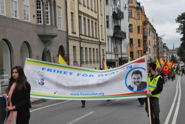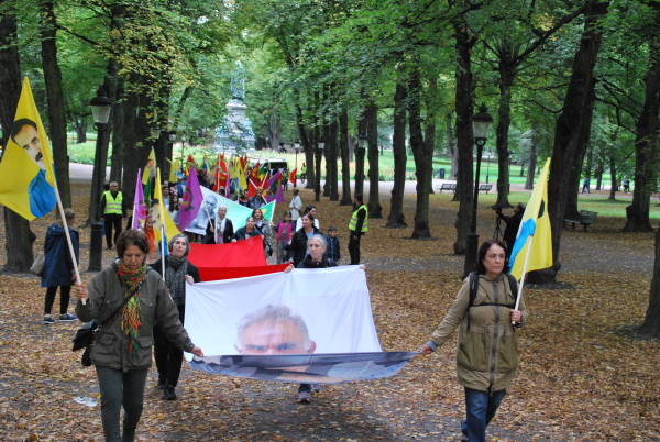 Stockholm merkezindeki Hemlegården Parkı'nda dün saat 14.00 sularında bir araya gelen Kürdistanlılar ve dostları, ”Öcalan'a özgürlük, Kürdistan'a barış”, ”Öcalan'a özgürlük” pankratları, büyük boy PKK bayrakları ve Öcalan'ın portlereini taşıyarak mitingin yapılacağı Odenplan Meydanı'na doğru yürüdü.