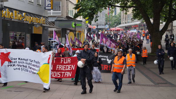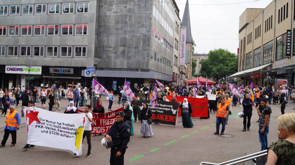Almanya’nın Essen kentinde de sembollerin yasaklanmasına karşı yüzlerce Kürdistanlı ve dostunun katılımı ile bir yürüyüş düzenlendi.
