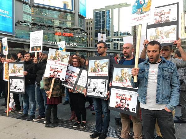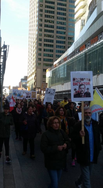 Toronto en işlek caddesi Yonge&Bloorda bir araya gelen Kürdistanlılar, referandumu hile ve baskılarla kendi lehine çeviren AKP rejimini protesto etti.