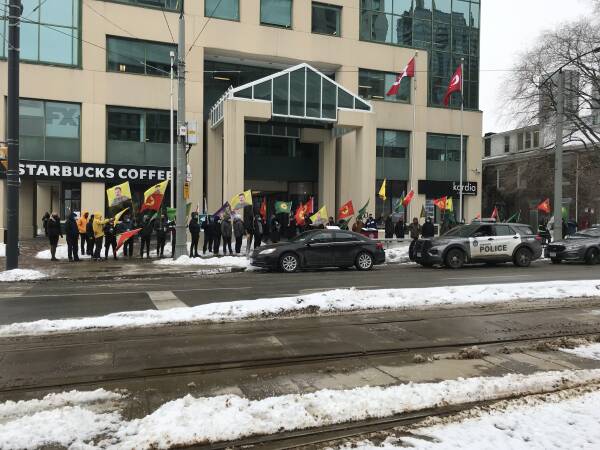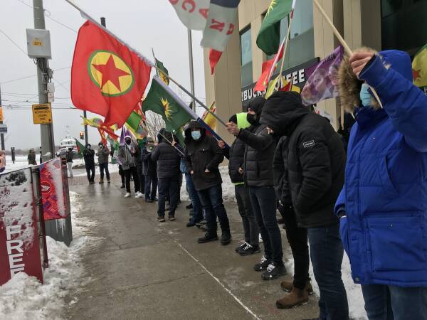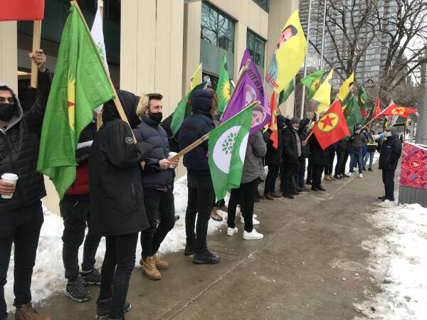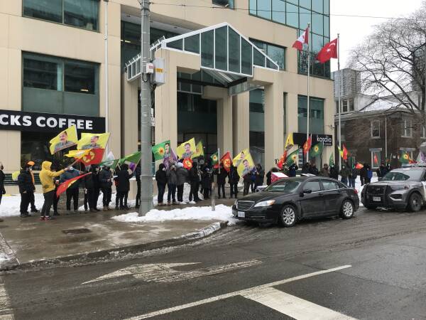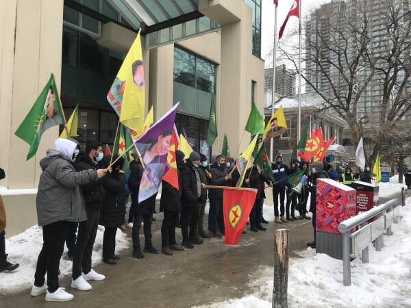 Kanada'nın Toronto kentinde Demokratik Kürt Toplum Meclisi’nin çağrısıyla bir araya gelen Kürdistanlılar, Toronto Türk Konsolosluğu önünde protesto gösterisi gerçekleştirdi.