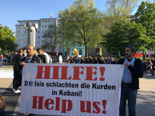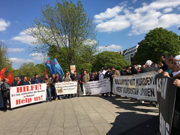 Almanya’daki Kürtlerin çatı örgütü Nav-Dem tarafından yapılan çağrı ve Düsseldorf, Köln ve Bonn Bölgelerin’deki Demokratik Toplum Merkezleri, kadın örgütleri ile birçok Alman ve Türkiye solu çevrelerinin de desteklediği eylem “Ey Raqip“ Marşının okunması ve saygı duruşu ile başladı.
