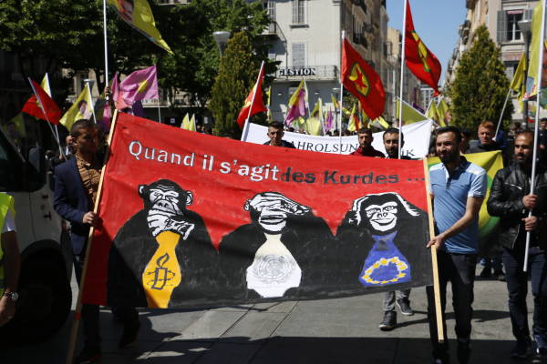 'Söz konusu Kürtler olunca', Uluslararası Af Örgütü, Birleşmiş Milletler ile Avrupa Birliği'nin üç maymunu oynadığını gösteren logolu pankartla yürüyüşe geçen yüzlerce Kürdistanlı, sık sık 'Biji Berxwedana Rojava', 'katil Erdoğan' ve 'biji serok Apo' sloganı attı. Yürüyüşte, Kürt Halk Önderi Abdullah Öcalan'ın posterleri, TJK-E flamaları ile Paris'te katledilen üç devrimci Kürt kadının resimleri taşındı.