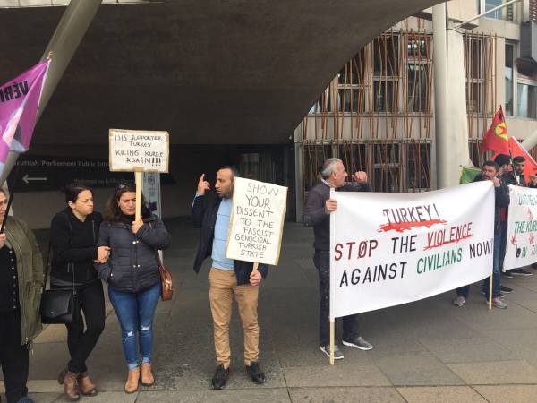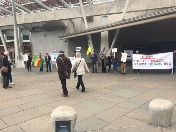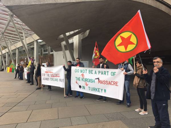 İskoçya’nın başkenti Edinburgh’da da Türk devletinin Rojava ve Şengal’e saldırıları protesto edildi. İskoçya Parlamentosu önünde bir araya gelen kitle, pankart açtı ve broşür dağıttı. AKP ve Türk ordusunun katliamlarının protesto edildiği eylemde sık sık sloganlar atıldı.