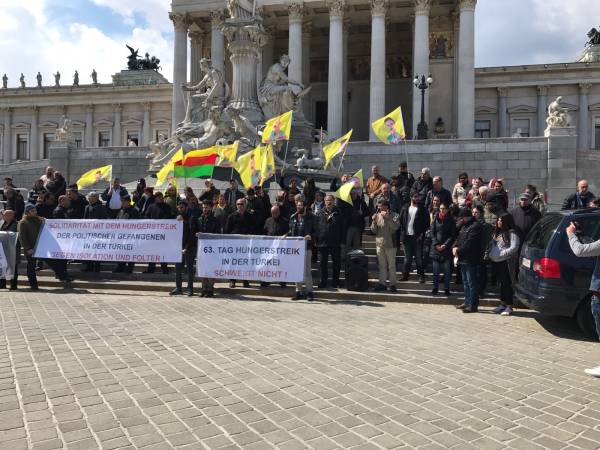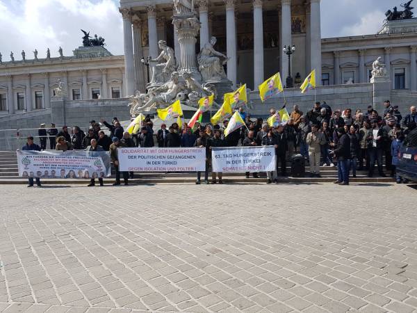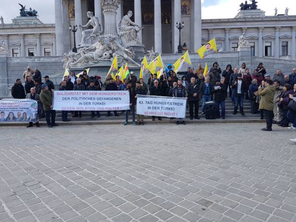 Avusturya'nın başkenti Viyana'da "Kürt Halk Önderi Abdullah Öcalan’ın üzerindeki tecridin kaldırılması, cezaevlerindeki hak ihlalleri ve baskıların son bulması" talepleriyle cezaevlerinde başlatılan açlık grevlerine destek vermek için başlatılan süresiz-dönüşümlü açlık grevi bugün 8. gününde devam ediyor. Bu kapsamda Avusturya Parlamentosu önünde açlık grevleriyle ilgili basın açıklaması ve miting yapıldı.