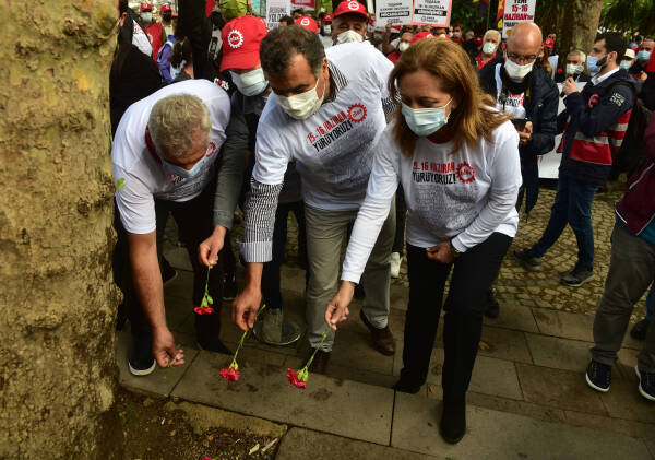 Bugün de bu kuşatmanın sürdüğünü vurgulayan Çerkezoğlu, ekonomik kriz ve salgın ile beraber bu ülkenin işçileri başta olmak üzere geniş halk kesimlerinin ağır bedeller ödediğini hatırlattı. İşsizliğin rekorlar kırdığını, çarşı ve pazardaki zamların ücretleri erittiğini dile getiren Çerkezoğlu, “Ekmeğimiz küçülüyor, faturalarımız kabarıyor” dedi. Bir yandan yoksulluk, diğer yandan servetlerin arttığına dikkat çeken Çerkezoğlu, iktidarın politik tercihlerinin adaletsizliği büyüttüğünü kaydetti. Başta işçi sınıfı olmak üzere halkın yaşam mücadelesinin verirken, az sayıda para ve iktidar sahibinin servetlerine servet kattığını hatırlatan Çerkezoğlu şöyle konuştu: “Üç, beş şirketin payına ballı beton ihaleleri, işçinin payına ise Kod-29 ile tazminatsız işten atılmak, ücretsiz izin, asgari ücretin altında kalan ‘ Kısa Çalışma Ödediği’ düşüyor. Yandaş şirketlerin payına devlet bankalarından geri ödemesiz krediler, işçinin, köylünün, öğrencinin, dar gelirlinin payına banka hacizleri düşüyor. Bir yandan yoksulluk ve işsizlik, bir yanda ölülerimiz; diğer yandan bir avuç ayrıcalıklı zümrenin hanları, hamamları, servetleri, sarayları büyüyor.”