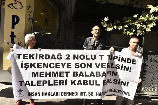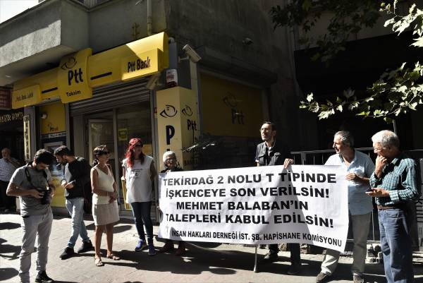 Taksim Sıraselviler Postanesi önünde bir araya gelen insan hakları savunucuları, "Tekirdağ 2 No'lu T Tipinde işkenceye son verilsin, Mehmet Balaban'ın talepleri kabul edilsin" pankartını açarak, "İnsanlık onuru işkenceyi yenecek" ve "Mehmet Balaban yalnız değildir" sloganları attı.