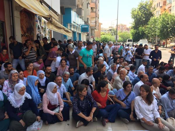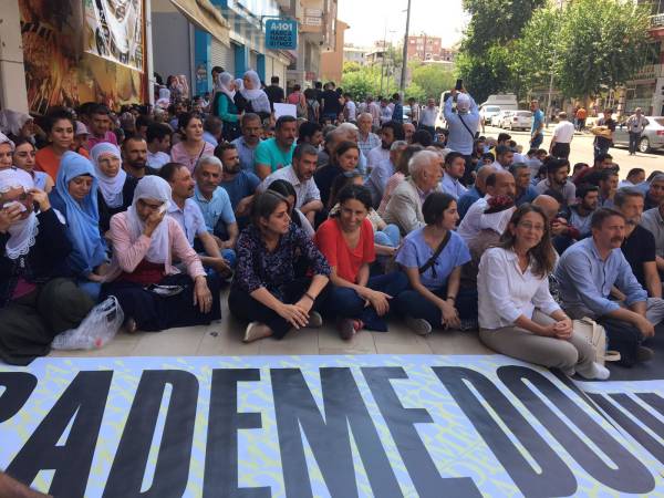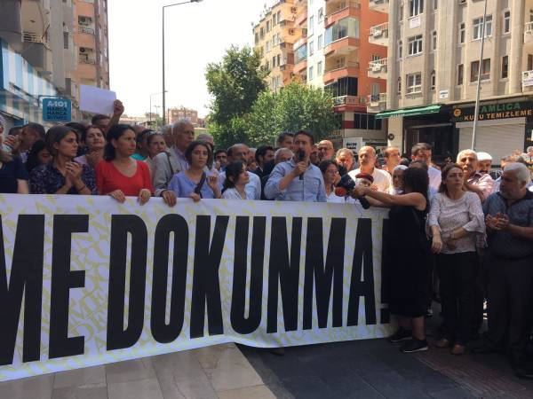 Görevi gasp edilen Amed Büyükşehir Belediyesi Eşbaşkanı Selçuk Mızraklı, eylem alanına geldiğinde “direne direne kazanacağız” sloganıyla karşılandı.