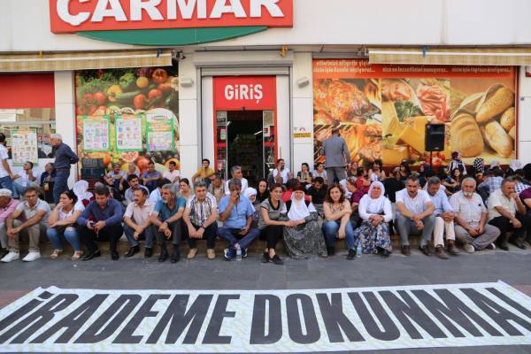 Nöbette “İrademe dokunma” pankartı taşınırken sık sık, “Kayyıma karşı baş kaldır”, “Direne direne kazanacağız”, “Kayyıma karşı omuz omuza” ve “Direne direne direnişten zafere” sloganları atıldı.
