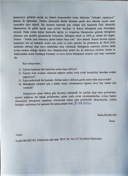 Evine yapılan baskın sonrası karnındaki bebeğini kaybeden 9 aylık hamile Rabia Bozkurt’un 31 Mart 2020 tarihinde Urfa’daki Cumhuriyet Başsavcılığı’na, “Ölüme sebebiyet, darp, tehdit, baskı ve görevini kötüye kullanma” suçlamasıyla polisler hakkında yaptığı suç duyurusuna ANF ulaştı.