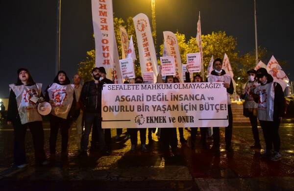 “Sefalete mahkum olmayacağız. Asgari insanca ve onurlu bir yaşam için Bütçe” yazılı pankart ile dövizlerin açıldığı eylemde, “Kuru soğana, kuru ekmeğe muhtaç olmayacağız” vurgusu yapıldı.