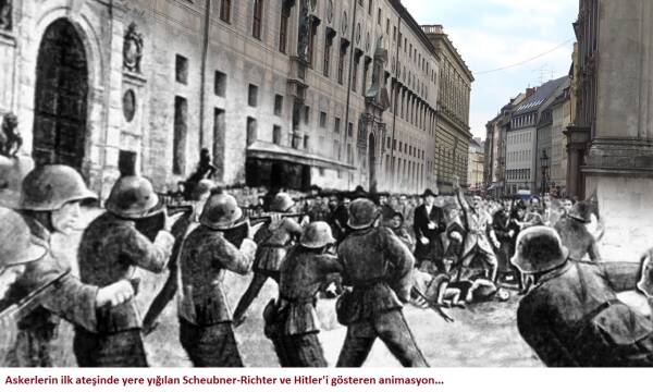 Naziler, 1. Dünya Savaşı'nda Alman askerlerinin söylediği " O Deutschland hoch in Ehren" (Haysiyeti Yüksek Almanya) marşını söyleyerek ilerliyorlardı. Yaklaşık yarım saat sonra, meydana metreler kala, askerlerin barikatıyla karşılaştılar. Yine de durmak bilmiyorlardı. Silahlar patladı. Ortalık kan gölüne döndü, ilk vurulanlardan birisi Hitler'in kolunu tutarak yürüyen Richter’di. 15 Nazi’nin hayatına mal olan bu saldırıda kolundan yaralanıp kaçan Hitler kıskıvrak yakalanacak, “Birahane darbesi” olarak Alman tarihine geçen kalkışmanın ardından cezaevi günlerinde kaleme alacağı "Kavgam"ın bir bölümünü Max Scheubner-Richter’e ithaf edecekti…
