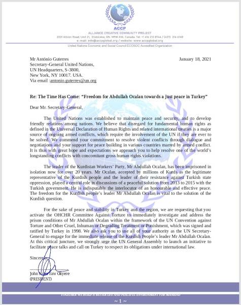 ACCP Başkanı John Nana Yaw Okyere, örgütü adına BM Genel Sekreteri Antonio Guterres’e bir gönderdiği mektupta şunları belirtti: “Kürdistan İşçi Partisi lideri Abdullah Öcalan 20 yıldan fazla bir zamandır tecrit altında tutulmaktadır. Milyonlarca Kürt tarafından Kürt halkının meşru temsilcisi ve Türk devletinin baskısına karşı direnişinin lideri olarak kabul edilen Abdullah Öcalan, Türk hükümeti ile 2013-2015 yılları arasında barışçıl çözüm tartışmalarında merkezi bir rol oynadı. Onurlu ve etkili bir barışın muhatabı olduğu tartışmasızdır. Kürt halkının lideri Abdullah Öcalan'ın özgürlüğü, Kürt sorununun çözümü için hayati önem taşımaktadır.