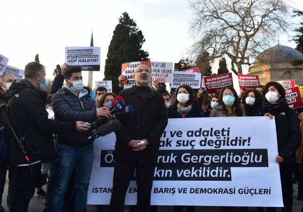 HDP’ye yönelik kapatma davası açılmasına ve Kocaeli Milletvekili Ömer Faruk Gergerlioğlu’nun vekilliğinin düşürülmesi yönelik tepkiler büyüyor. Beşiktaş Barbaros Meydanı’nda kitlesel açıklama yapan İstanbul Emek Barış ve Demokrasi Güçleri, iktidarın bu sivil darbesini kabul etmeyeceklerini vurguladı. “Barışı ve adaleti savunmak suç değildir, Ömer Gergerlioğlu halkın vekilidir” yazılı pankartın açıldığı eyleme, HDP Milletvekilleri Oya Ersoy, Züleyha Gülüm, HDP İstanbul İl Eşbaşkanı Erdal Avcı yanı sıra çok sayıda siyasi parti ve demokratik kitle örgütü temsilcisi katıldı.