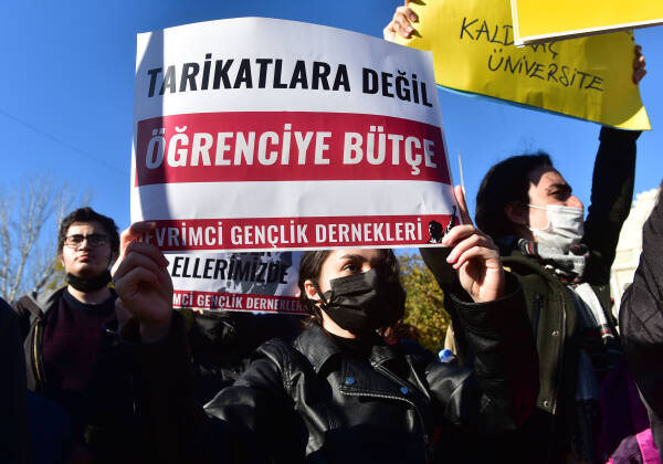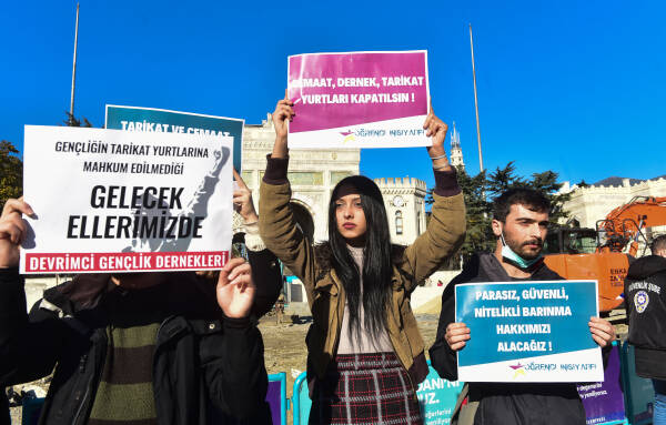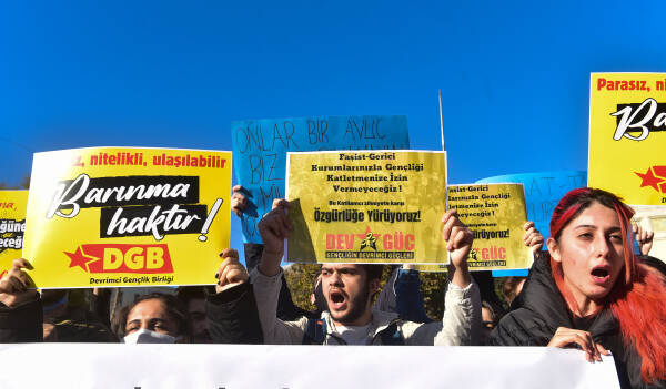 “Parasız, nitelikli, ulaşılabilir barınma haktır, dinci, gerici tarikat yurtlarına karşı mücadeleye” yazılı pankart, “Tarikatlara değil öğrencilere bütçe”, “Çeteleşen tarikat yurtlarına karşı mücadeleye” dövizleri taşındı.