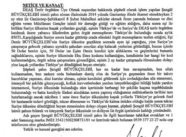 Eşinin DAİŞ’e katılmak isteyenlerin sınırdan geçişlerini organize ettiğine itiraz eden Büyükçelebi, kendisinin de Suriye’de bulunduğu dönemde eşine yardım ettiğini ve bunun karşılığında örgütten aylık olarak belirli miktarda ödenek aldığını belirtti. Büyükçelebi, ifadesinde Suriye’ye geçmeden önce de özellikle yabancı ülkelerden gelen örgüt mensuplarını evlerinde ağırladıklarını ve bir süre sonra eşinin aracılığıyla bunların Suriye’ye geçişinin sağlandığını kaydetti.