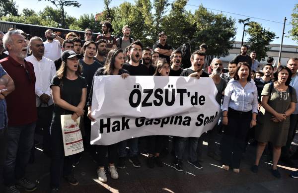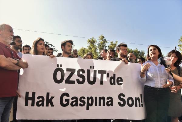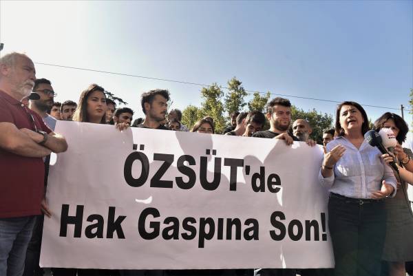 “ Özsüt gaspına son” yazılı pankartının açıldığı eylemde, sık sık, “Haksızlık varsa direniş var”, “ Yaşasın devrimci dayanışma”, “Özsüt işçisi yalnız değildir”, “ Direne direne kazanacağız”“ Köle değiliz işçiyiz örgütlüysek güçlüyüz” sloganları atıldı.
