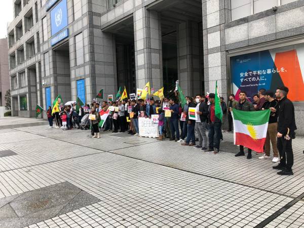 Japonya’nın başkenti Tokyo’da da aynı amaçla bir protesto eylemi düzenlendi. 100 dolayında kişi BM temsilciliği önünde bir araya gelerek işgali ve katliamları kınarken, uluslararası toplumu işgali durdurmaya çağırdı.