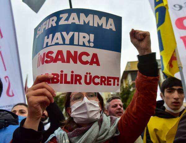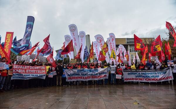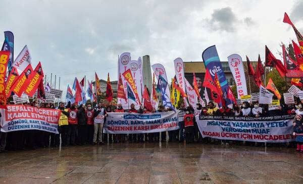 Asgari Değil İnsanca Yaşam Bileşenleri’nin çağrısıyla Bakırköy Özgürlük Meydanı'nda, "Sefalet ücretini kabul etmeyelim. Sömürü, rant, talan, savaş düzenine karşı birleşelim" şiarıyla kitlesel eylem düzenlendi.