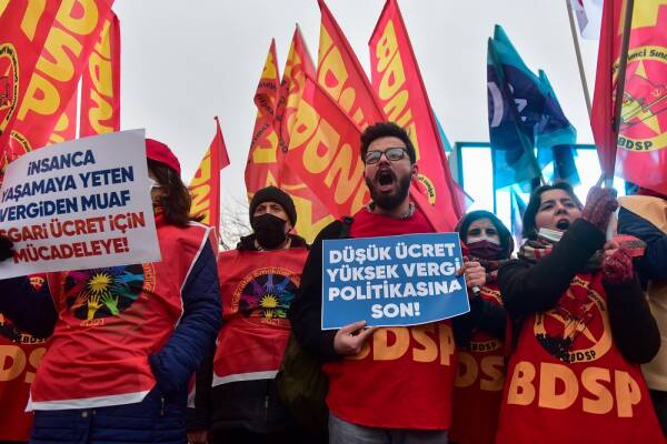 2021 yılı başında 380 Dolar olan asgari ücretin, şu anda ise 270 Dolar’a gerilediğine dikkat çeken Karaçam, “Dolar artışı ile ne işiniz var diyenler, temel kurun her yükselişinde temel tüketim ürünlerine yapılan zamları ise görmezden gelmektedirler. Tablo işçi ve emekçiler için bu kadar açıkken Erdoğan konuşmasında, ‘son 50 yılın en yüksek zammı’, tescilli patron uşağı Türk-İş Genel Sekreteri Pevrul Kavlak ise ‘Emekçileri tatmin edeceğini düşünüyorum’ ifadelerini kullanmaktan geri durmamışlardır. Toplumun gerçekliklerinden kopuk açıklamaları yapanların tek dertlerinin sermayenin çıkarları olduğu açıktır. Açlık ve yoksulluğun her geçen gün artığı koşullarda bu kadar rahat hareket etmelerinin arkasında ise sınıfın güçlü örgütlülüklere sahip olmaması yatmaktadır. Hükümet temsilcileri, düzen siyasetinin tüm aktörleri ve TİSK doğrudan sömürücü sınıfın temsilcileridir. Türk-İş bürokratları ise sömürücü sınıfların işçi sınıfı içindeki ajanları ve bir parçasıdır” dedi.