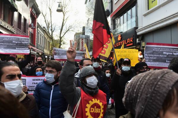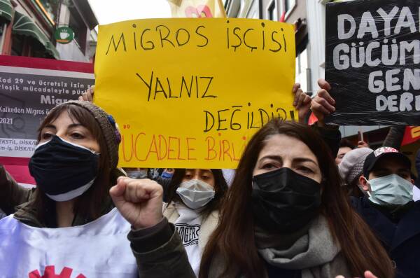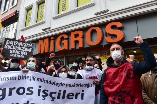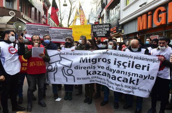 DİSK’e bağlı Dev Tekstil, İnşaat-İş, Basın-İş, Dev Yapı-İş, Dev-Turizm-İş, Enerji-Sen, Limter-İş sendikaları, Kadıköy Khalkedon’daki Migros önünde Migros Depo işçileri için dayanışma eylemi yaptı. Eylem öncesi Migros’un önünü abluka altına alan polisler, İstanbul Valiliği yasağını gerekçe göstererek açıklamayı engellemek istedi. Tüm engellemelere rağmen açıklamayı Migros önünde gerçekleştiren sendikalara, HDP Milletvekili Züleyha Gülüm yanı sıra çok sayıda siyasi parti ve demokratik kitle örgütü temsilcisi destek verdi.