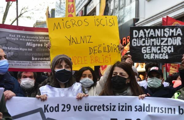25 gündür aynı kararlılıkla direnişin sürdüğünün altını çizen Karaçan, ücretsiz izin uygulamasını takip eden diğer saldırının işten atmalar olduğunu dile getirdi. İş Kanunu’nun 25/2 Maddesine dayandırılarak Kod 29 ile işten atmanın salgın döneminde yaygınlaştırılarak kalıcı hale getirildiğini vurgulayan Karaçan, şunları kaydetti: "'Ahlak ve iyi niyet kurallarına uymayan haller ve benzerleri' gerekçesiyle suçlanan işçiler, SGK’nin kodlamasına göre Kod 29 ile işten çıkarılıyor, tazminat alamıyor. Kod 29’la atılan işçiler adeta fişlenmiş oluyor ve başka işlere girmeleri de neredeyse imkansız hale getiriliyor. Bu noktada Ekmekçioğulları, Baldur, Sinbo, PTT, Mapfre Sigorta Tur Assist, Döhler, Galataport, İGDAŞ, Kaynak İplik, Cargill ve yine birçok işyerinde işçiler benzer saldırılarla karşı karşıya kaldılar ve direnişleri, mücadeleleri sürüyor. Bizler de buradan direnen tüm işçi arkadaşlarımızın mücadelesini büyüteceğimize söz veriyoruz. Migros işçisi yalnız değildir."