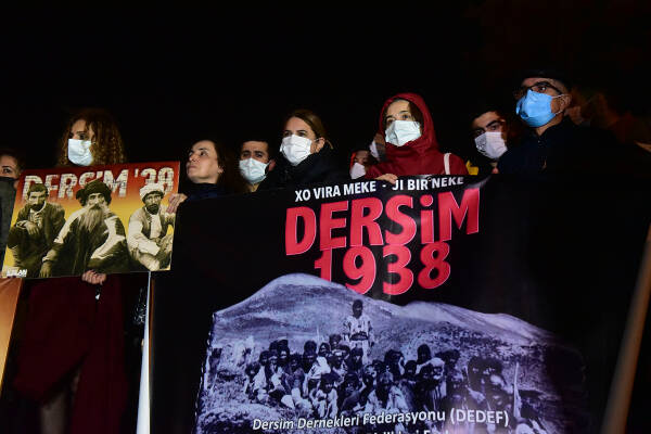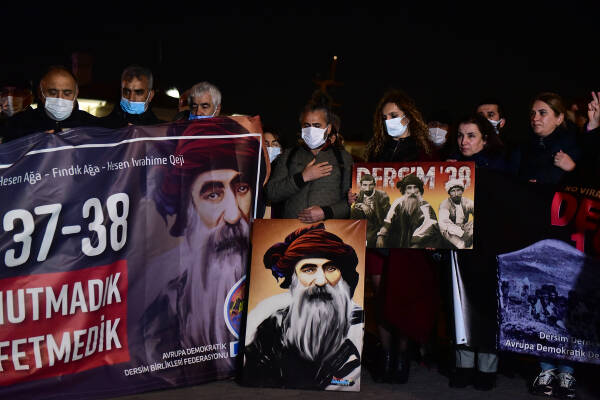 “Hiçbir şey unutmadık, hiçbir şey affetmedik” ile Kürtçe, Zazaca ve Türkçe yazılı, “Dersim 37-38 kara gün” pankartları açıldı.