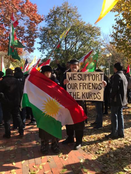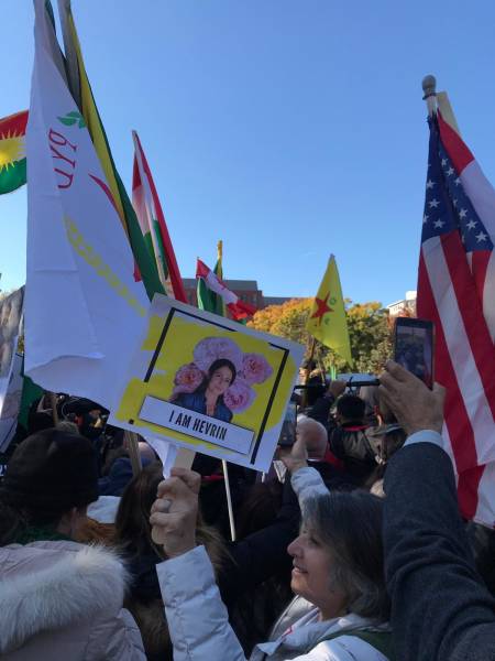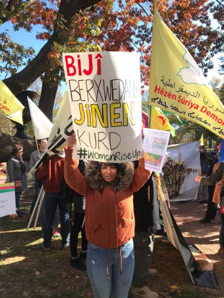 Kürdistanlıların yanı sıra Yahudiler, Amerikalılar, Ermeniler ve Yunanlıların da destek verdiği eylemde sık sık, “Katil Erdoğan, Rojava’dan defol”, “Türkiye Rojava’dan defol”, “Terörist Erdoğan”, “DAİŞ=Erdoğan” sloganları atıldı.