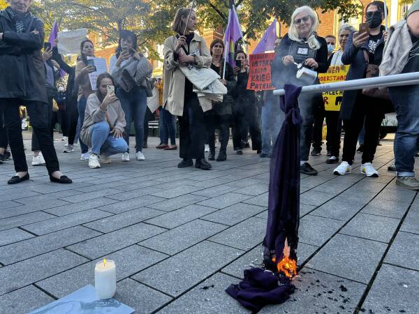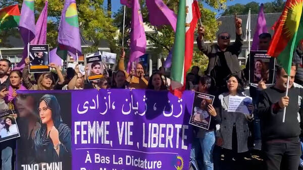 Jîna Emînî'nin resminin yer aldığı büyük bir pankart ve erkek egemen zihniyetini ifade eden dövizler açan kadınlar, İran devletini protesto etti. Ayrıca eylemde erkek egemen zihniyetini ifade eden ve İran rejiminin katlettiği Jîna Emînî için yapılan protesto eylemlerinde kadınlara yönelik yapılan tutuklamalar ve işkenceleri anlatan yüzlerce bildiri dağıtıldı.
