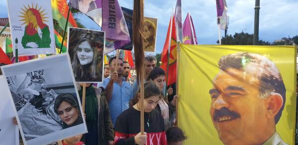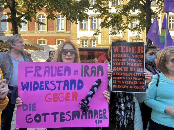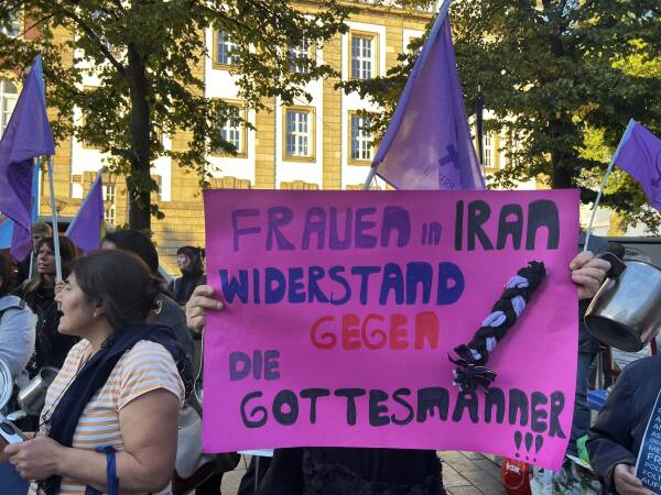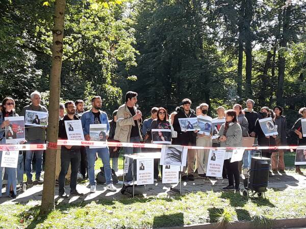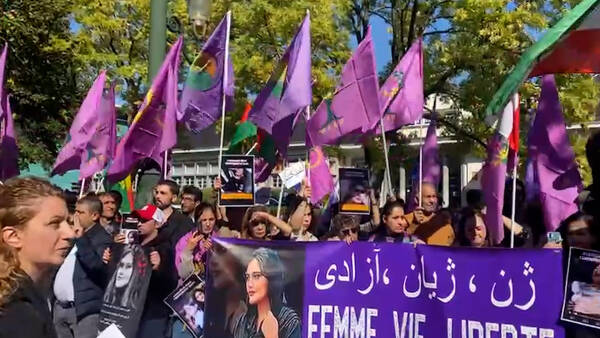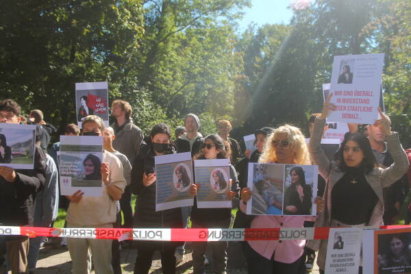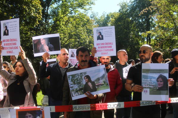Almanca, Kürtçe ve Farsça bildirilerin okunduğu eylemde sık sık “Jin, jiyan, azadî” ve “Kahrolsun molla rejimi” sloganları atıldı.