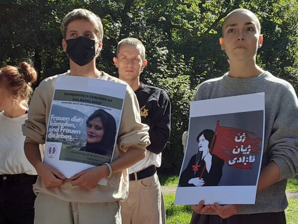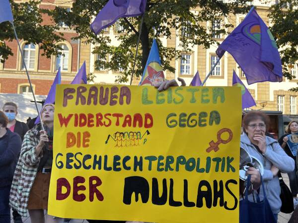 Sosyalist Kadınlar Birliği adına Almanca yapılan konuşmada şunlar ifade edildi: "Biz Avrupa Sosyalist Kadınlar Birliği olarak genç bir kadın olan Jina'nın katledilmesi karşısında İran’da gerici, politik İslamcı, erkek egemen faşist rejimi lanetliyor ve kınıyoruz.