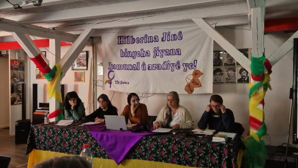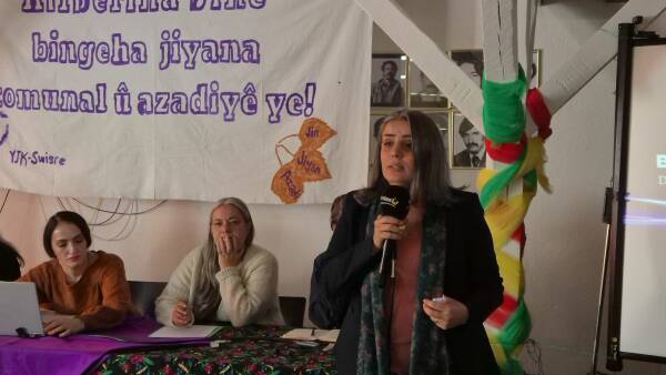 Katılımcı kadınlar bu sunumun ardından “Bijî Berxwedana Rojava” ve “Jin, Jiyan, Azadî” sloganları attı.