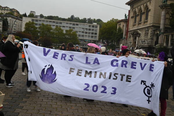 Feminist Grev kolektiflerinin Lozan koordinasyonu, SSP Vaud'u çağrısıyla Place de Ripponne'da her kesimden kadın kurumu ve siyasi partinin katılımıyla yapılan yürüyüş öncesi açıklama okundu.