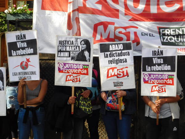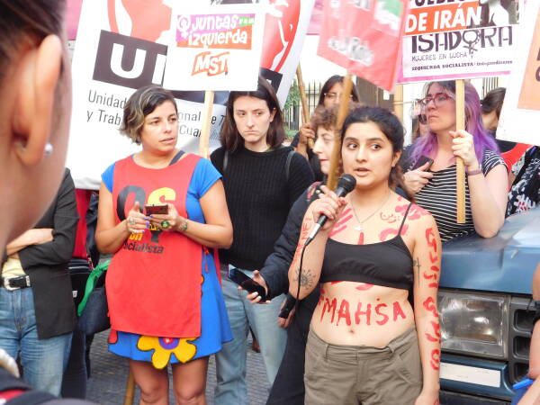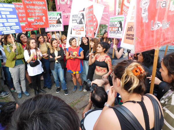 Eylem, saat 18.00’da yüzlerce kişinin İran Konsolosluğu önünde toplanmaya başlamasıyla başladı. Aralarında Plaza de Mayo Anneleri’nden Nora Cortiñas, Kürdistan Kadın Hareketi ile Dayanışma Komitesi, Ni Una Menos, Kürtaj Hakkının Legalleşmesi örgütü gibi 32 kurum ve şahsiyetin yaptığı çağrı ile gerçekleşen eylemde Rojhilatê Kurdistan’daki direnişe destek çağrısı yapıldı.