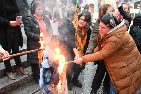 Eylemde yine “Jin Jiyan Azadî” sloganı eşliğinde kadınlar saçlarını keserken, yanlarında getirdikleri başörtülerini yaktı.