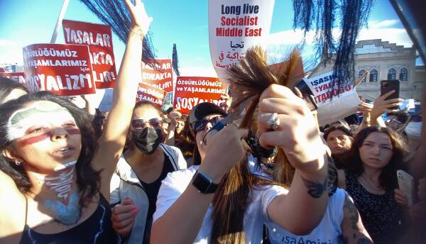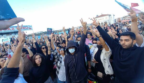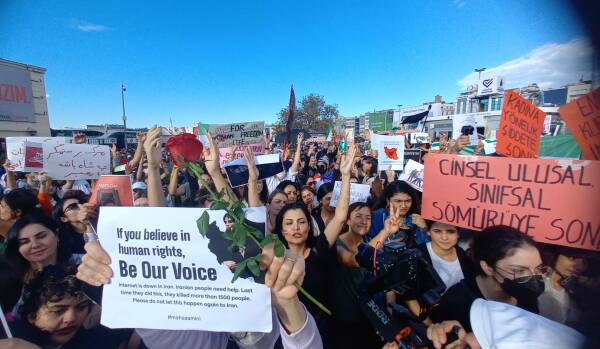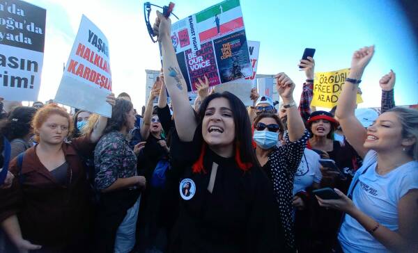 Türkiye'de yaşayan İranlıların yoğun katılımıyla gerçekleşen eylemde,” İran'da, Türkiye'de ve her yerde özgürlük” yazılı pankart açıldı, Jîna Emînî'nin ve direnişin sembolü olan saç bayrakları taşındı. Sık sık, “Jin jiyan azadî” sloganının atıldığı kitlesel eylemde, Kadınlar Birlikte Güçlü adına açıklama Türkçe, Farsça ve Kürtçe okundu.